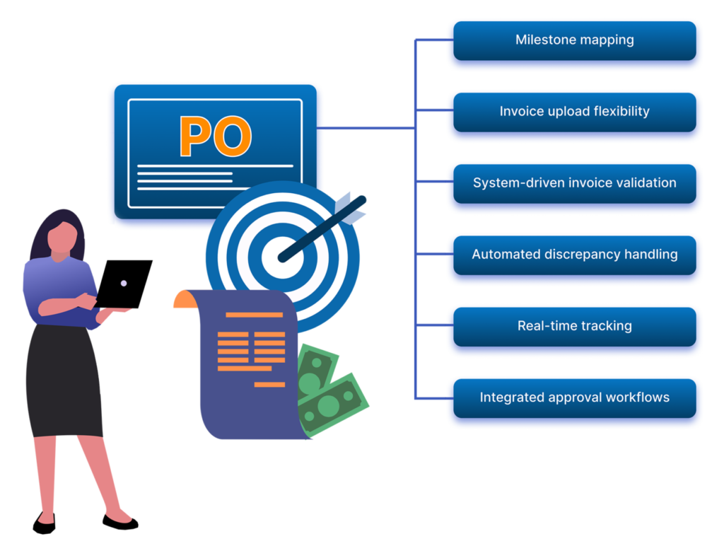 • System-driven invoice validation: The system automatically cross-checks invoice details with PO milestones before submission.