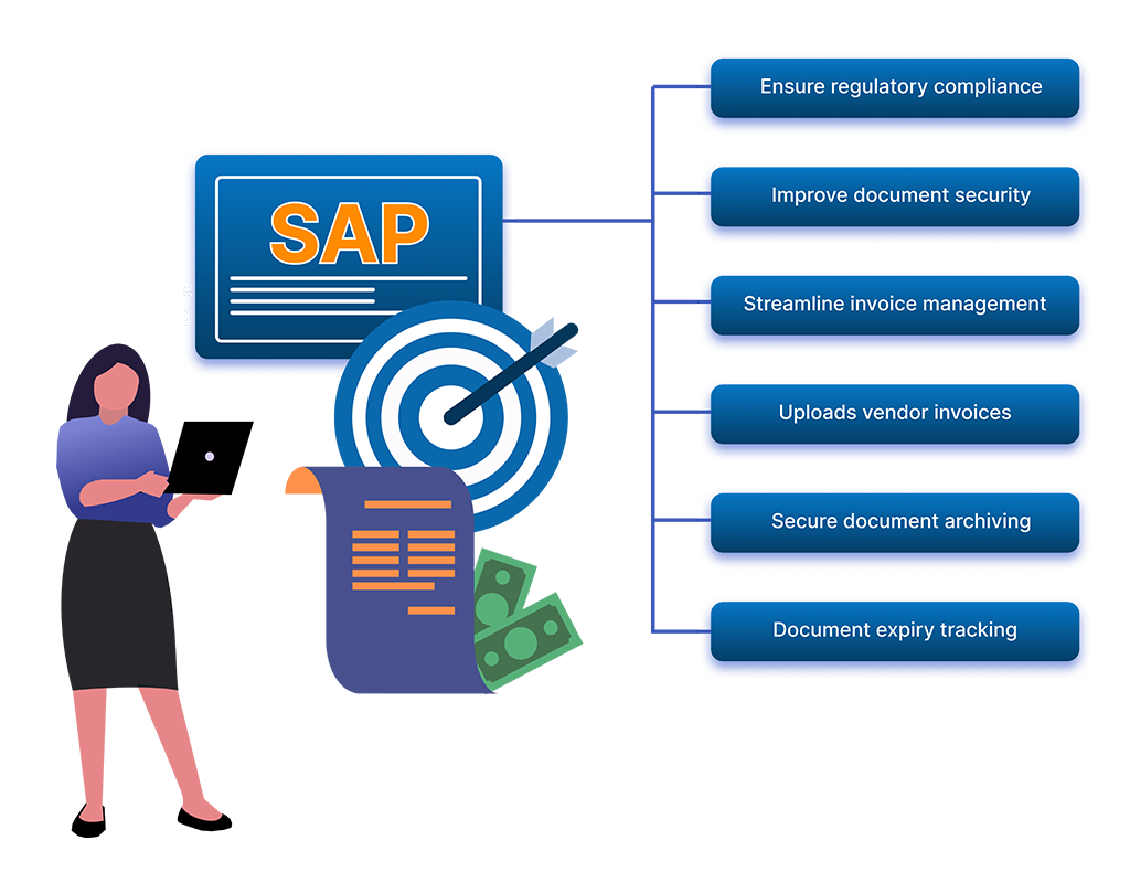 • Automatically uploads vendor invoices and supporting documents into DMS like SAP DMS.